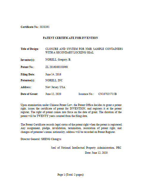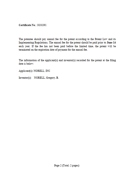 注:ZL 2016 8 0033896.0專利持有人歸屬于諾雷爾公司(Norell, Inc. )
