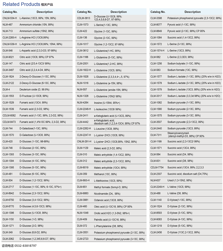 Isotope tracers are essential tools for monitoring metabolic pathway activity, i.e. fux. To quantitate fux in central carbon metabolism in cultured mammalian cells, D-Glucose (13C6, 99%) (CLM-1396) or L-Glutamine (13C5, 99%) (CLM-1822) is added to media lacking these principal nutrients. Cells are grown in the labeled media, and metabolite labeling is measured by GC/MS or LC/MS. Glucose has traditionally been considered to be the primary carbon source for many cell types, especially cancer cells. Recent studies show, however, the glutamine often plays a predominant role in feeding the tricarboxylic acid (TCA) cycle.The extent of contribution of glutamine to TCA cycle four-carbon units can be measured based on malate and asparate labeling, and to two-carbon units based on acetyl-CoA and fatty acid labeling. Citrate is a particularly informative molecule, because it refects both two- and four-carbon units of the TCA cycle. With modern instrumentation, it is possible to measure in parallel the isotope labeling of all of these species, and dozens more, enabling systems-level flux quantitation. These methods can translate also to the in vivo setting, with mice or patients infused with labeled nutrients prior to resection of a tumor or other tissue specimen.