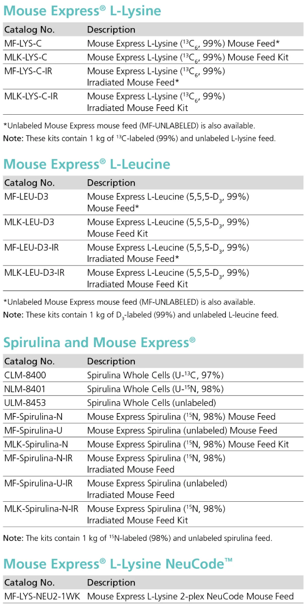 劍橋同位素實驗室公司(CIL)提供標記/未標記飼料,用于將穩(wěn)定同位素或天然氨基酸代謝納入小鼠(或大鼠)體內(nèi),用于基于SILAM的質(zhì)譜研究。