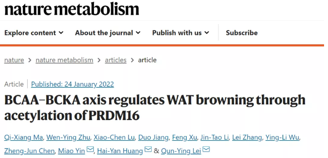 2022年1月24日,復旦大學雷群英、黃海艷和尹淼聯合在Nature Metabolism雜志發(fā)表了題為BCAA–BCKA axis regulates WAT browning through acetylation of PRDM16 研究文章,作者發(fā)現BCAT2(白色脂肪中代謝BCAA的關鍵酶)全脂肪特異敲除小鼠以及白色脂肪特異敲除小鼠能抵抗高脂誘導的肥胖,深入研究發(fā)現脂肪組織中敲除BCAT2減少了BCAA來源的Ac-CoA,造成Prdm16乙?;较陆?,從而增強轉錄因子Prdm16和Pparγ相互作用,促進了白色脂肪棕色化。進一步藥物篩選發(fā)現替米沙坦直接結合BCAT2來抑制BCAA代謝,從而抵抗高脂誘導的小鼠肥胖,為臨床藥物治療肥胖提供了思路。