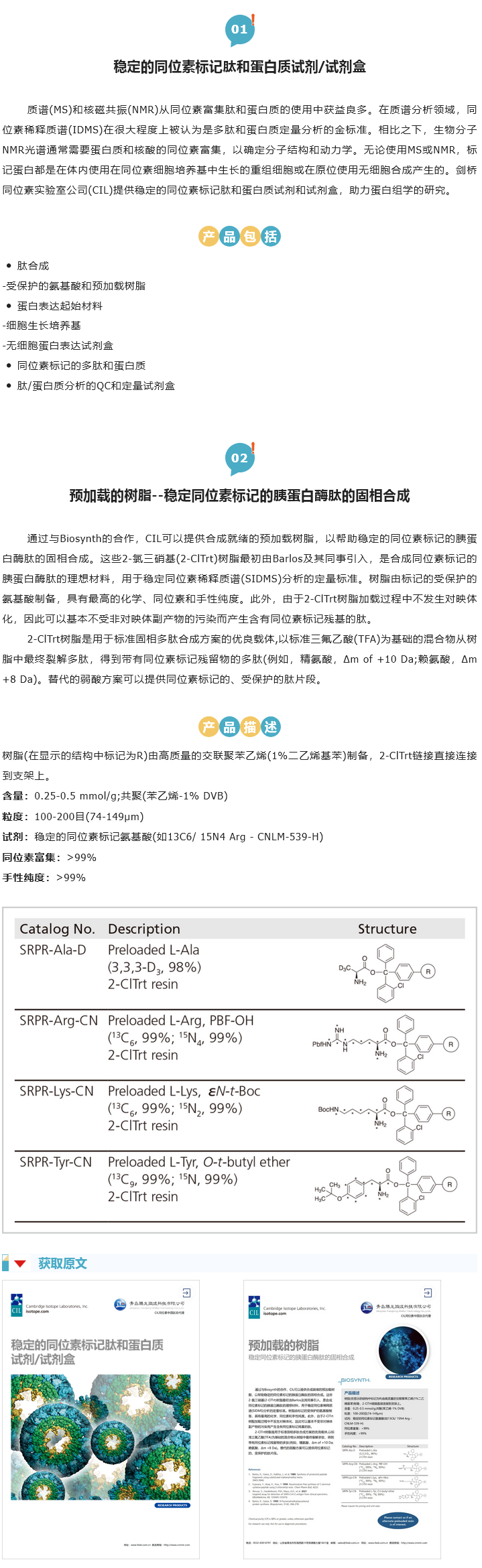 CIL提供各種特征良好,可變標(biāo)記,穩(wěn)定的同位素標(biāo)記起始材料,為了合成用于定量質(zhì)譜蛋白質(zhì)組學(xué)的高質(zhì)量多肽。其中包括受保護(hù)的和自由的氨基酸以及合成的預(yù)加載樹(shù)脂。