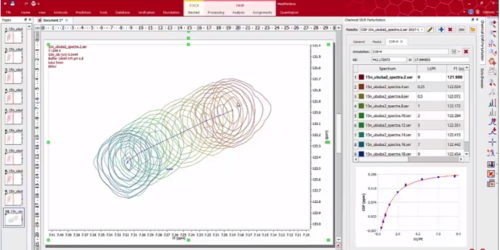 Mnova Binding包含用于NMR的AFFINImeter的免費1年的使用權(quán) 用于核磁共振的AFFINImeter允許對來自2D NMR滴定的結(jié)合等溫線進行高級分析,以測量結(jié)合常數(shù) (KA)。結(jié)合等溫線直接從軟件Mnova導(dǎo)入,AFFINImeter-NMR中提供了一系列高級工具,以充分利用NMR數(shù)據(jù),包括: 結(jié)合等溫線的全局分析 使用復(fù)雜的Binding模型進行分析 先進的算法可以保證收斂,避免局部極小值,并評估參數(shù)的不確定性、擬合優(yōu)度和結(jié)果的可靠性