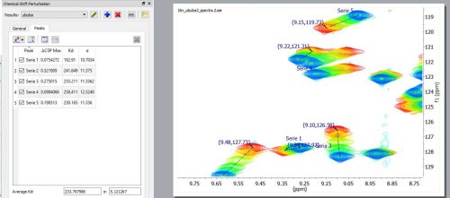 自動跟蹤和測量具有CSP的HSQC疊加譜圖。左圖顯示了兩個歸屬譜峰的移動。右側(cè)顯示了其中一個跟蹤峰“13C-H”的詳細信息,包括配體/蛋白質(zhì)的濃度比、任意維度的CSP測量值、歸一化CSP以及Kd的擬合結(jié)果和誤差。。