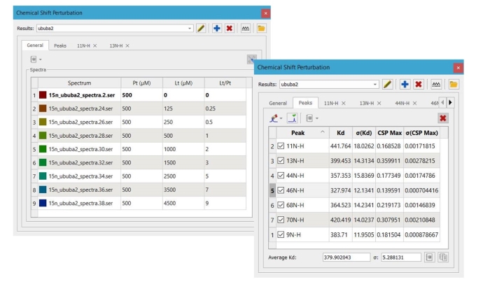 它還顯示了所有分析峰的CSP測量和Kd擬合列表,以及Kd的平均值和標準誤差。