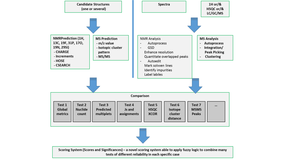 ♠ 為提出的結構生成預測數(shù)據(jù)(1H、13C、HSQC譜圖預測—Mnova NMRPredict. 質量電荷數(shù)、同位素簇、碎片和MS/MS預測)。
